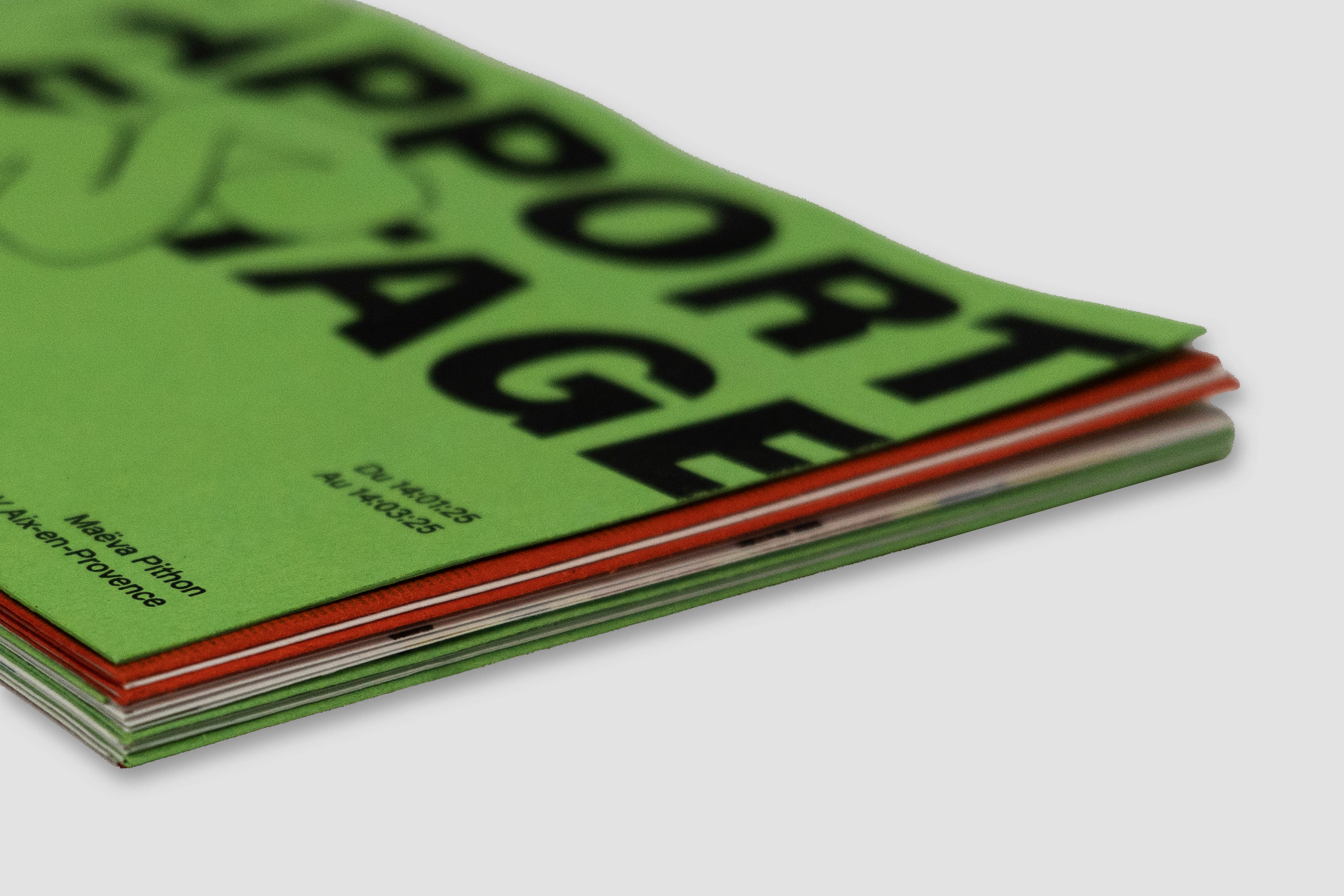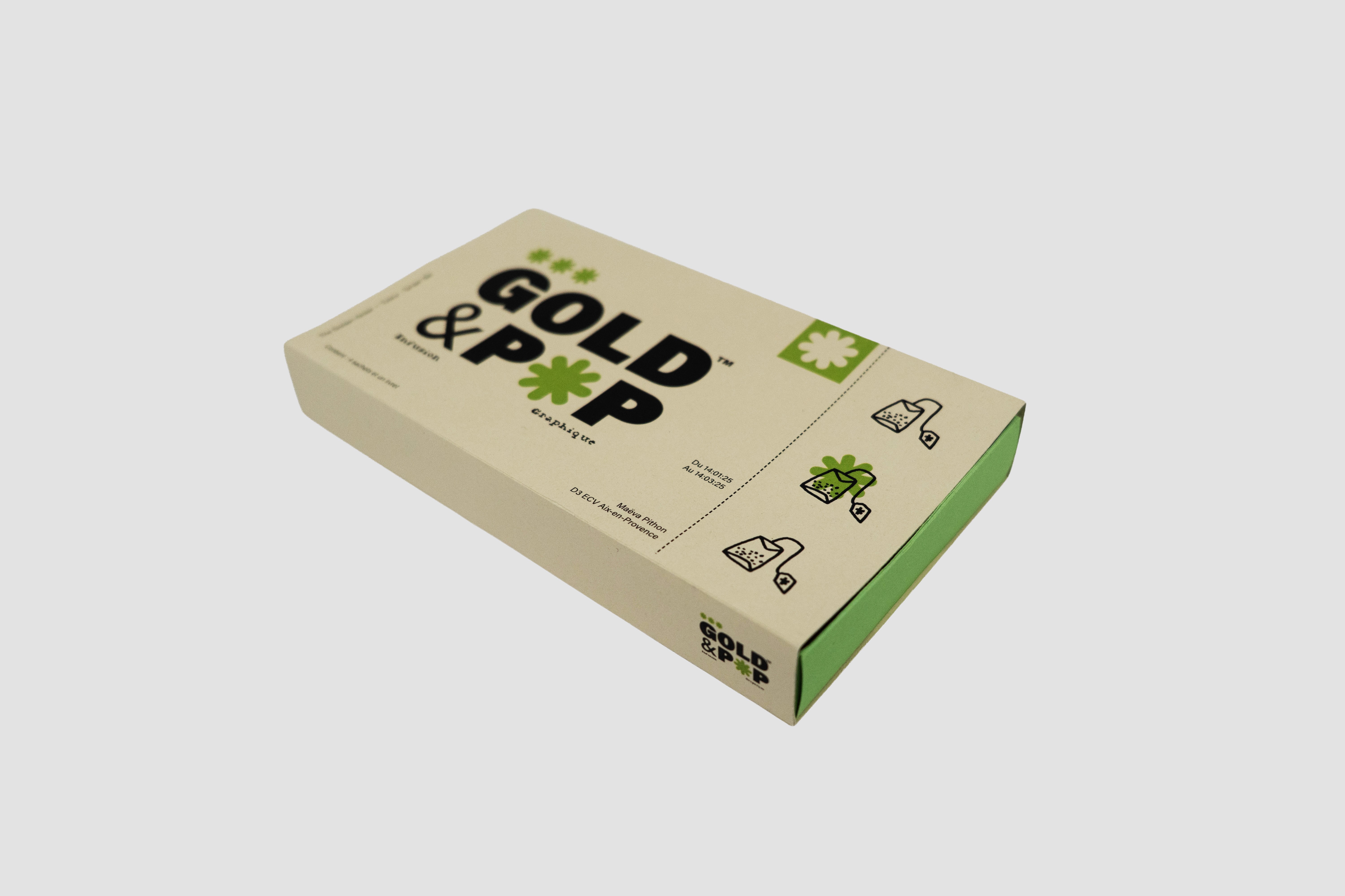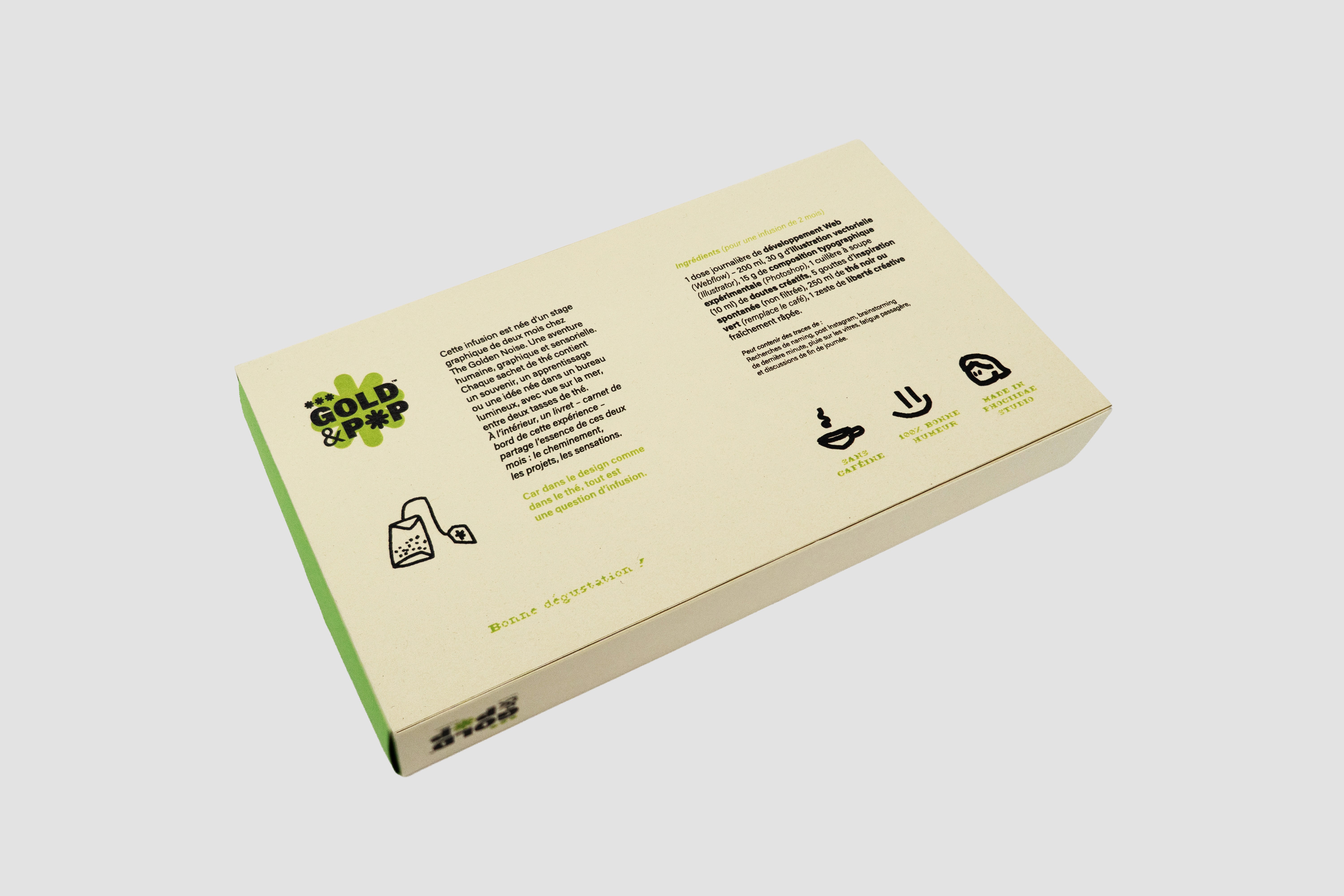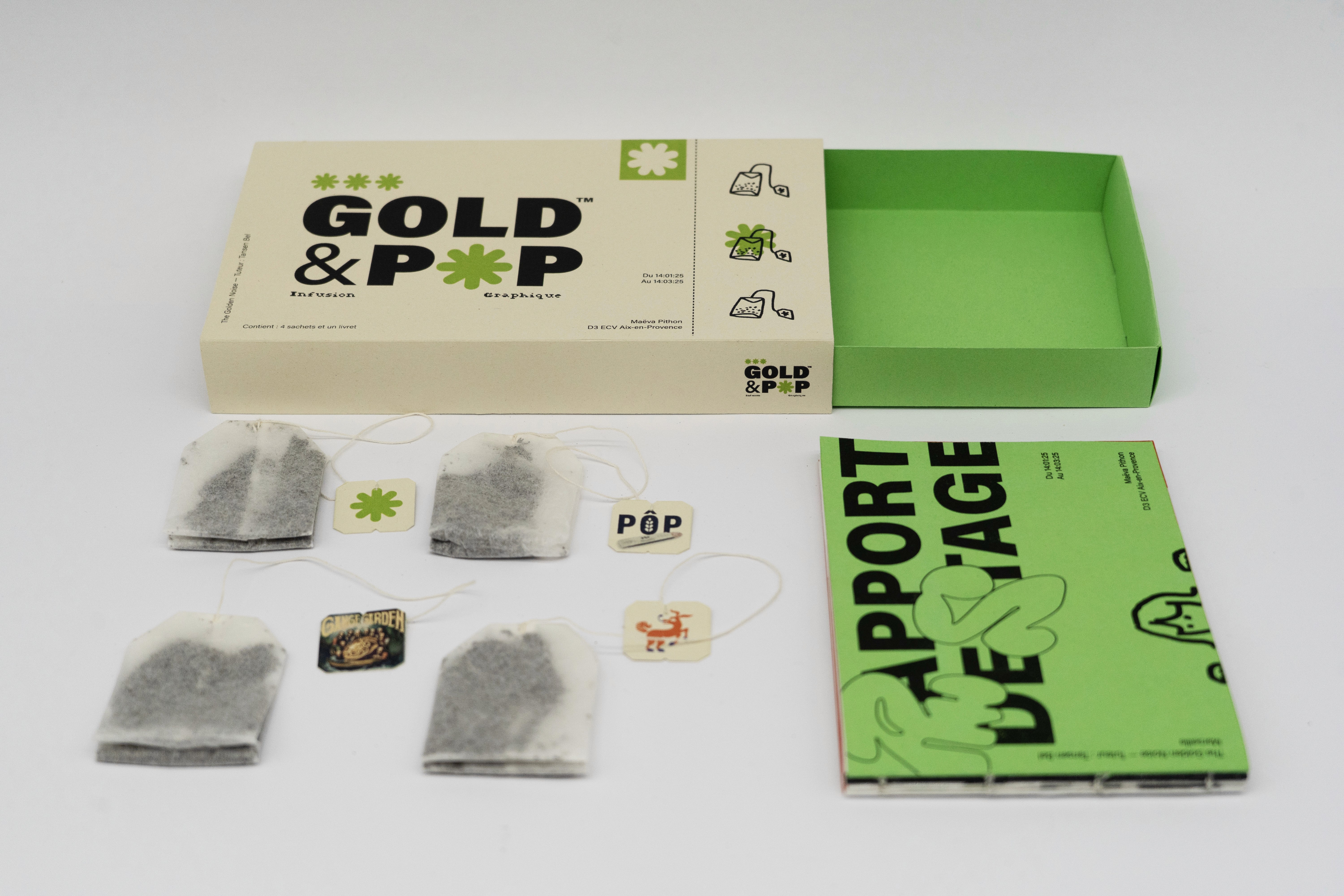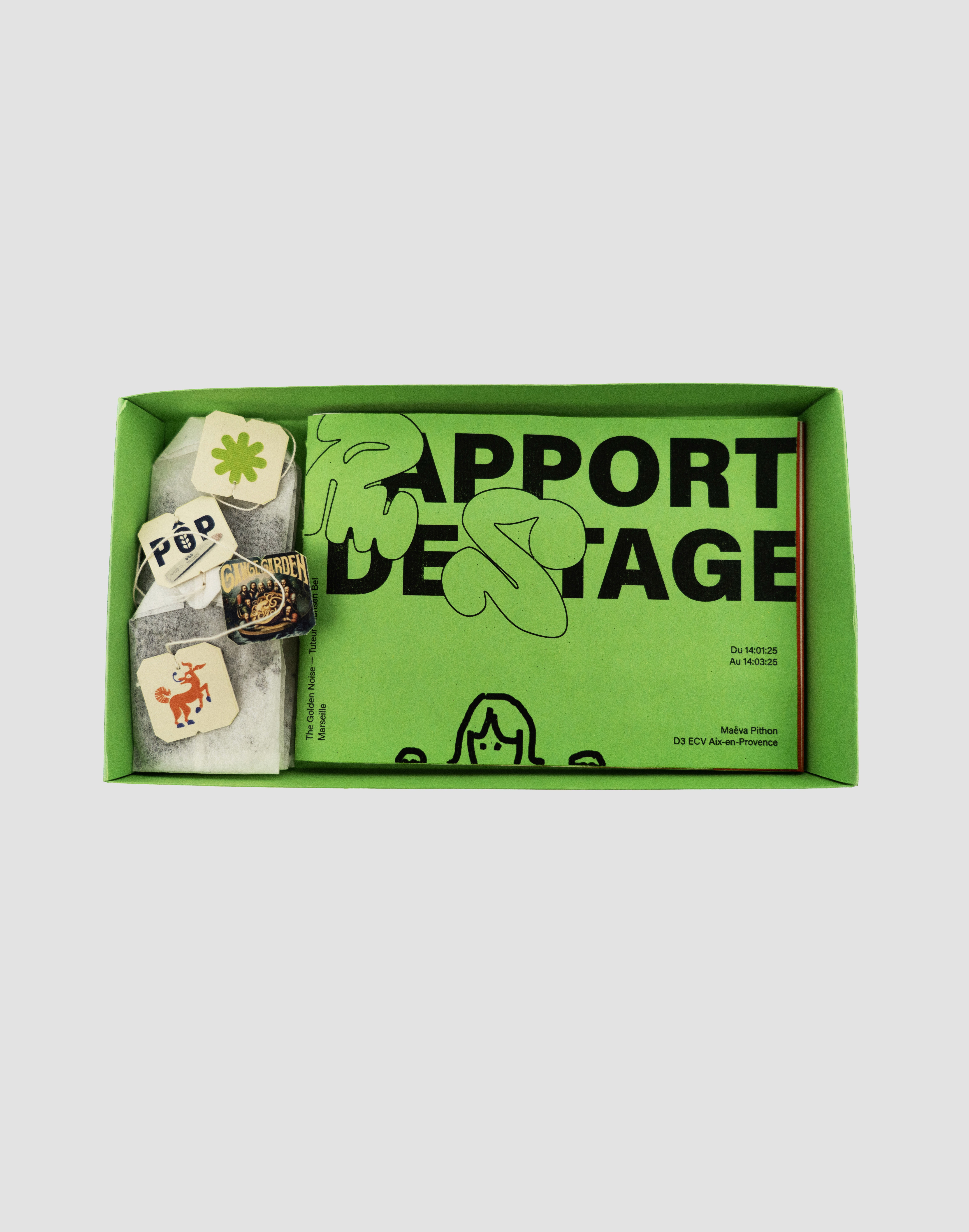 Dans ce rapport de stage, je raconte avant tout une histoire, celle d'une aventure de deux mois dans un studio graphique au bord de la mer. Au courant de mon stage, j’ai décidé sur un coup de tête d’arrêter radicalement le café, car j’en buvais beaucoup et cela me rendait plus anxieuse et fatiguée. Au final, j’ai donc passé mes journées à boire du thé. Un changement subtil, mais symbolique, qui me représente aussi dans ce parcours. C'est ainsi que m'est venue cette idée : créer une marque de thé qui rassemble l'essence de mon expérience et qui présente tous mes projets de stage. Contenu de la boîte : 4 sachets de thé et un livret.