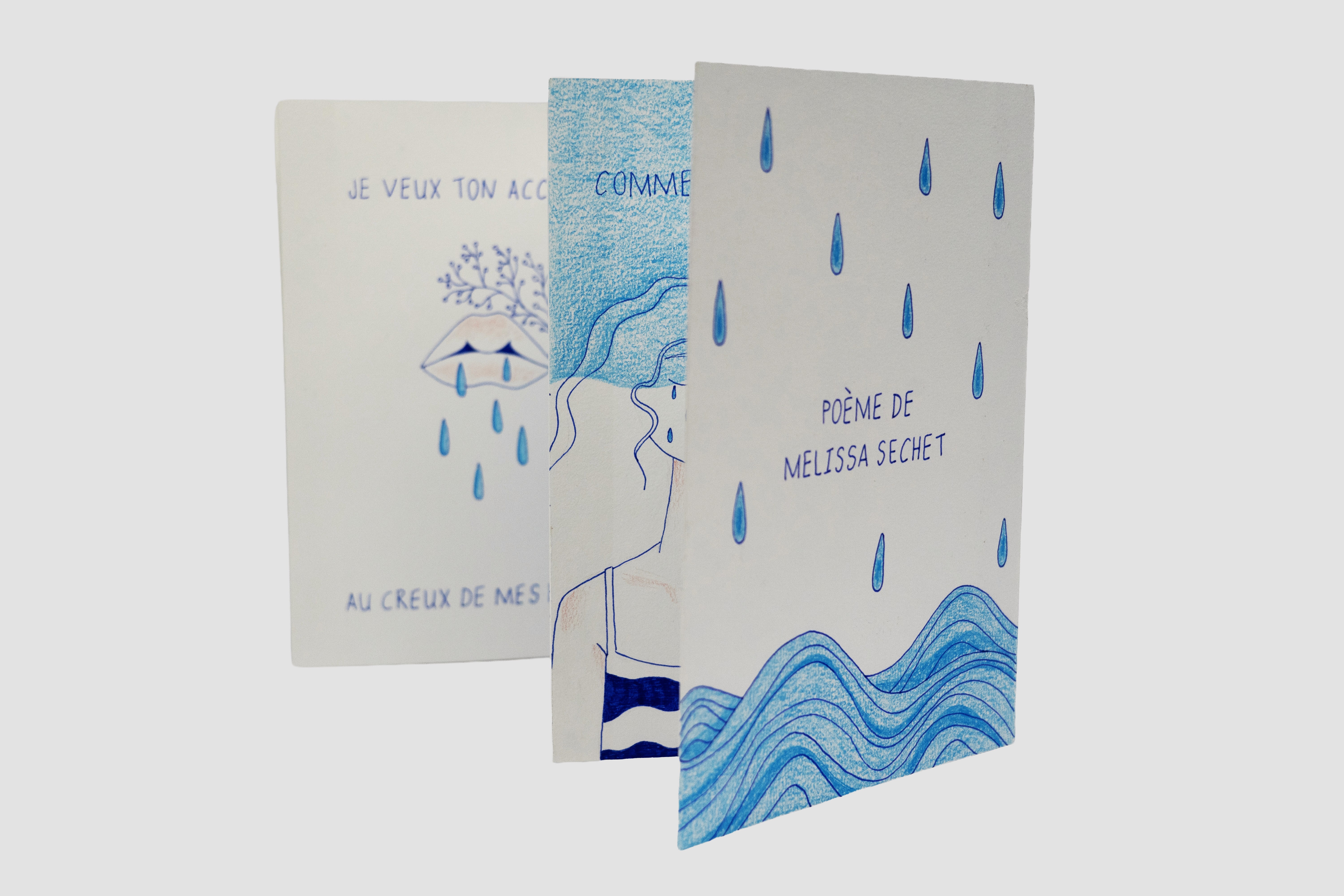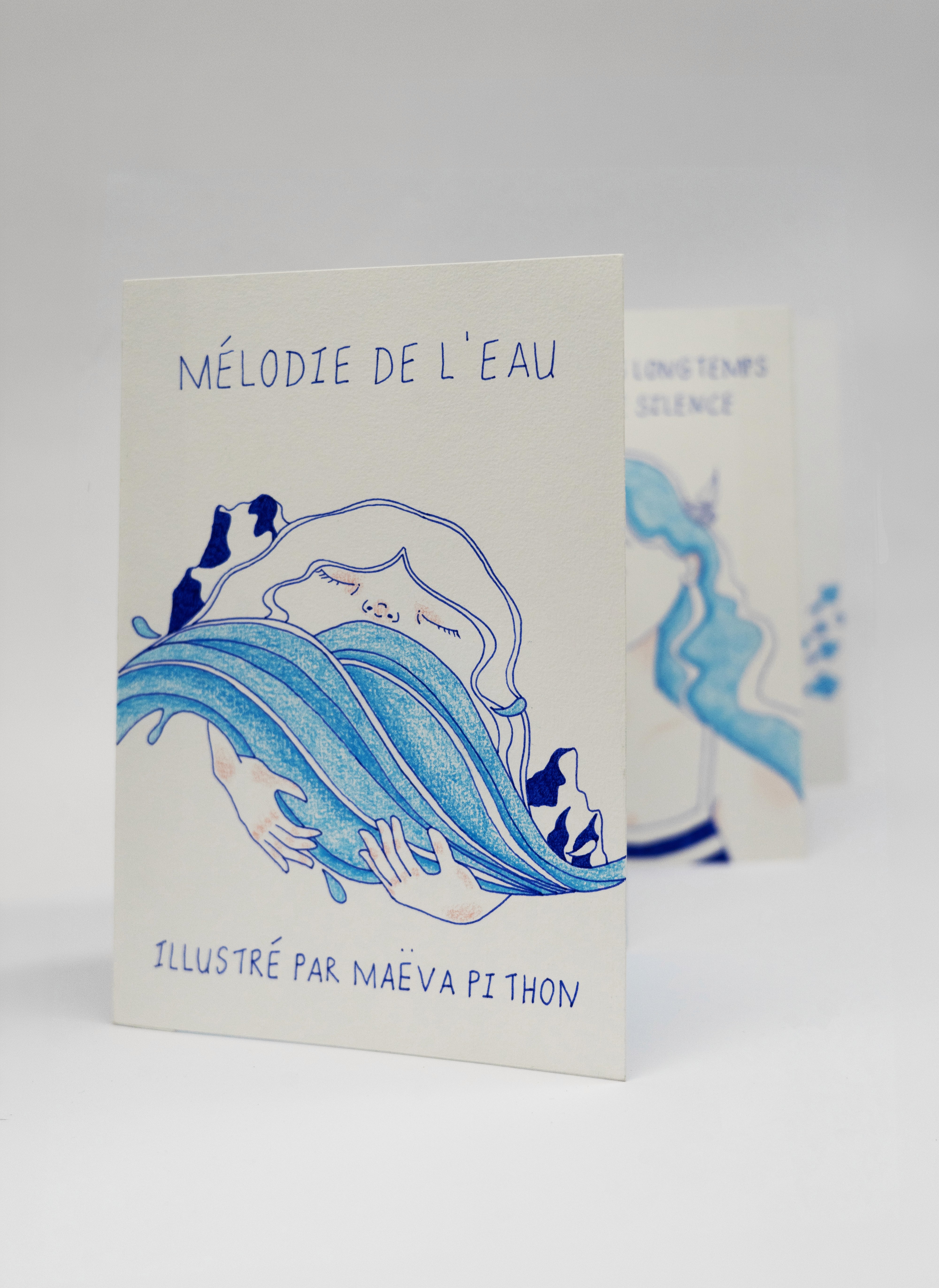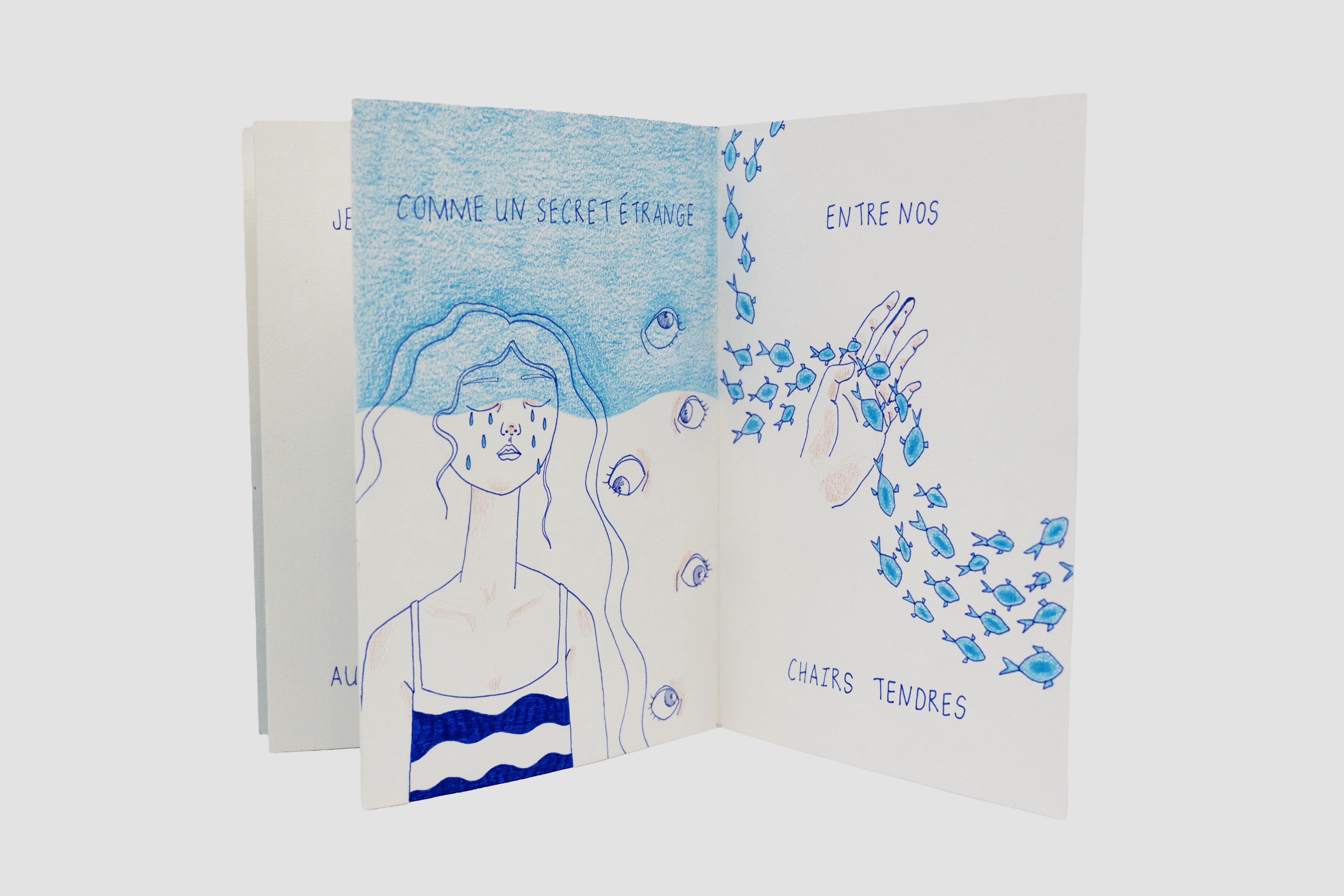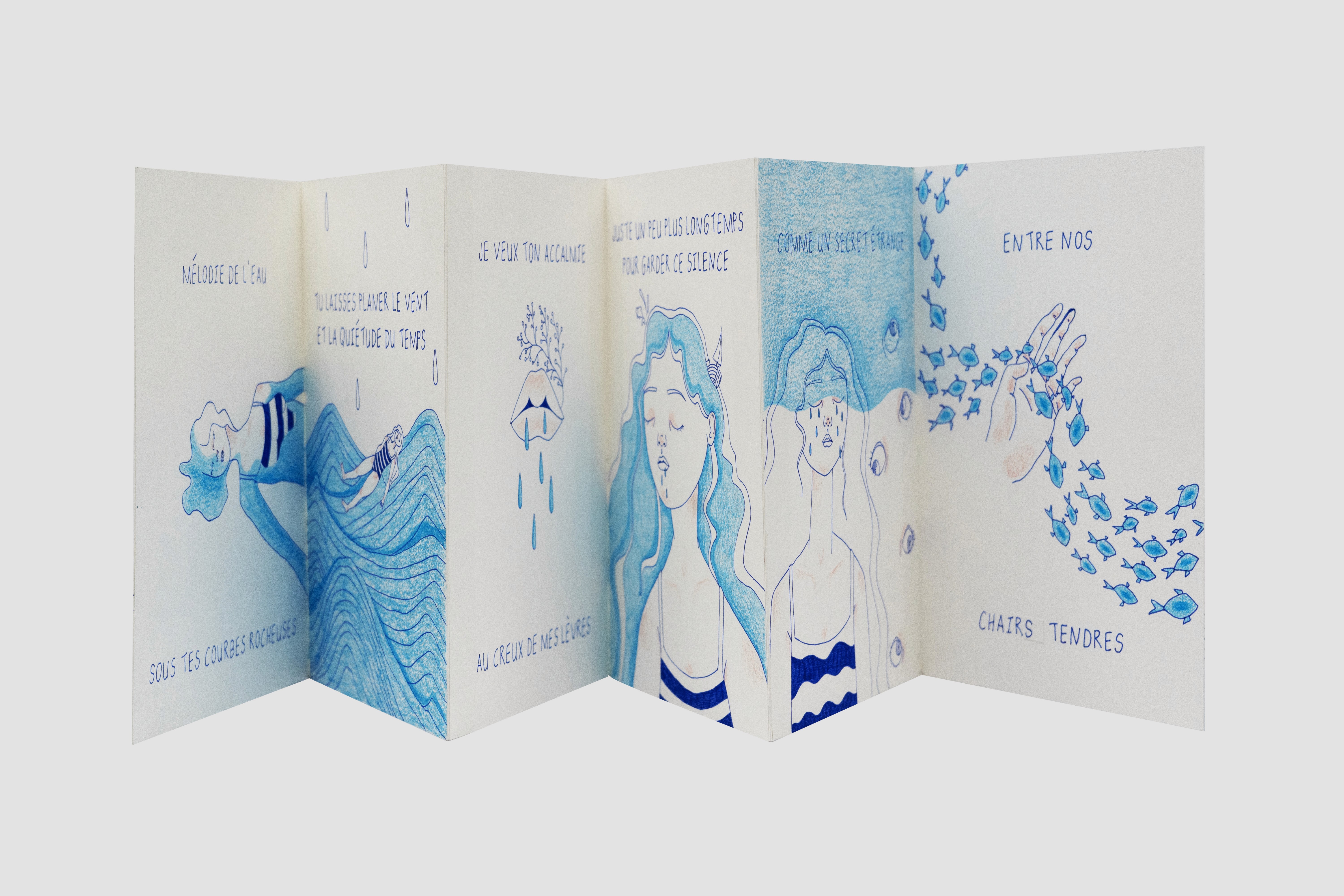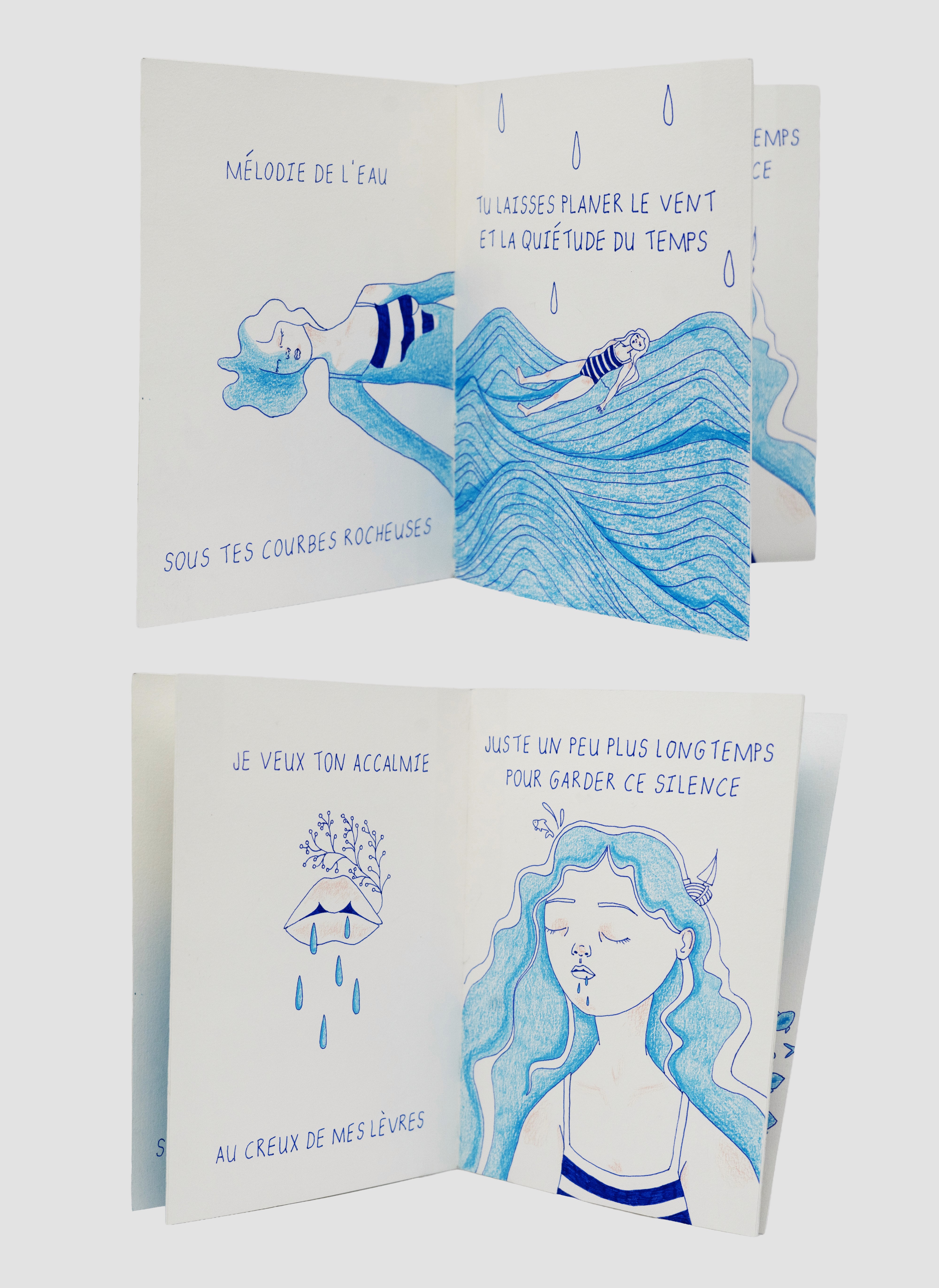 J'ai illustré un poème écrit par mon amie et autrice Mélissa Séchet, pour en faire un zine en accordéon. J'ai été très touchée par la sensibilité des mots de cette poésie. Elle raconte la rencontre entre le corps et l'eau, pour une parenthèse hors du temps. La lecture du poème m'a inspiré une série d'illustrations qui traduisent mon interprétation. L'eau peut incarner une rivière, un lac paisible ou encore la mer déchaînée. Elle entre en relation avec le corps, pour ne faire plus qu'un. J'ai pris la liberté de jouer avec le sens du poème qui parle d'une eau calme, en dessinant une mer agitée, afin de raconter la sérénité intérieure lorsque les émotions sont vécues avec l'intensité qu'elles méritent. L'eau enveloppe le corps, le berce, coule du sommet de son crâne puis devient corps à son tour au travers de la vie qui l'habite, et la relation devient alors plus sensuelle lors de la rencontre entre les chairs de la main et celles des poissons qui incarnent la vague.Technique : feutre fin et crayons de couleurs.