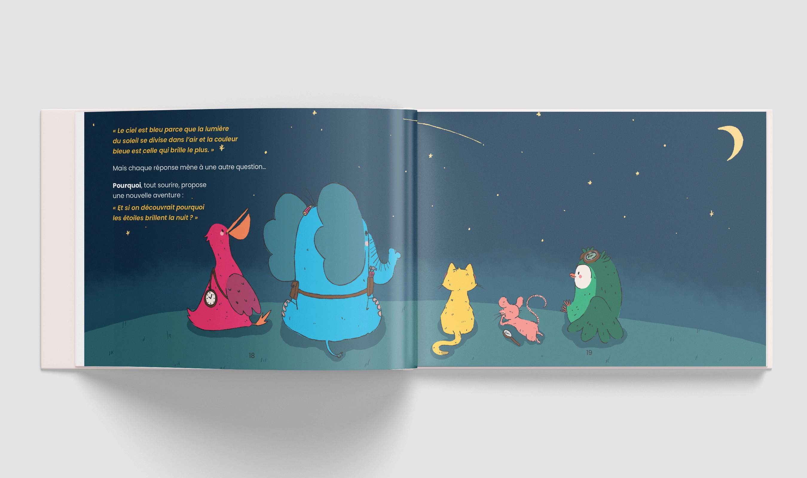 J'ai eu l'opportunité d'illustrer le premier album pour enfant de Flore Flipo, qui s'est lancé le défi de répondre de façon ludique aux grandes questions des tout petits. Dans ce numéro, aux côtés des cinq personnages attachants auxquels j'ai pu donner vie, les 4-8 ans découvrent pourquoi le ciel est bleu.