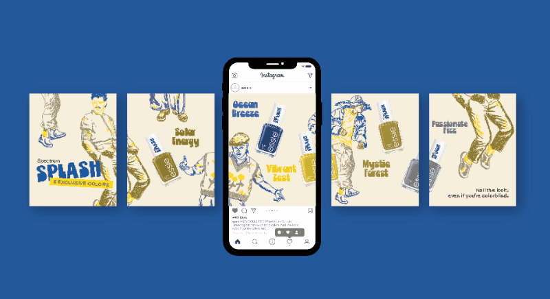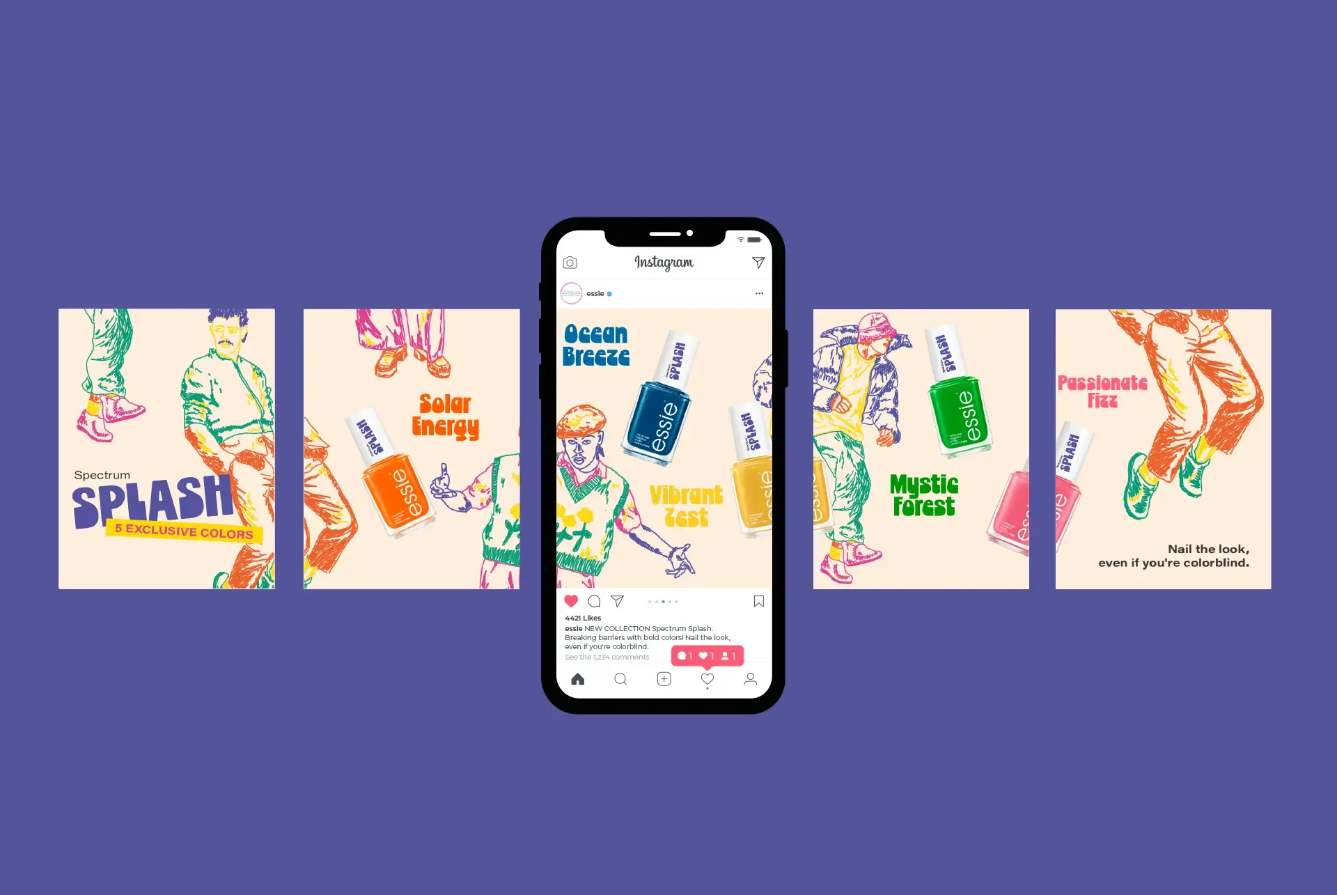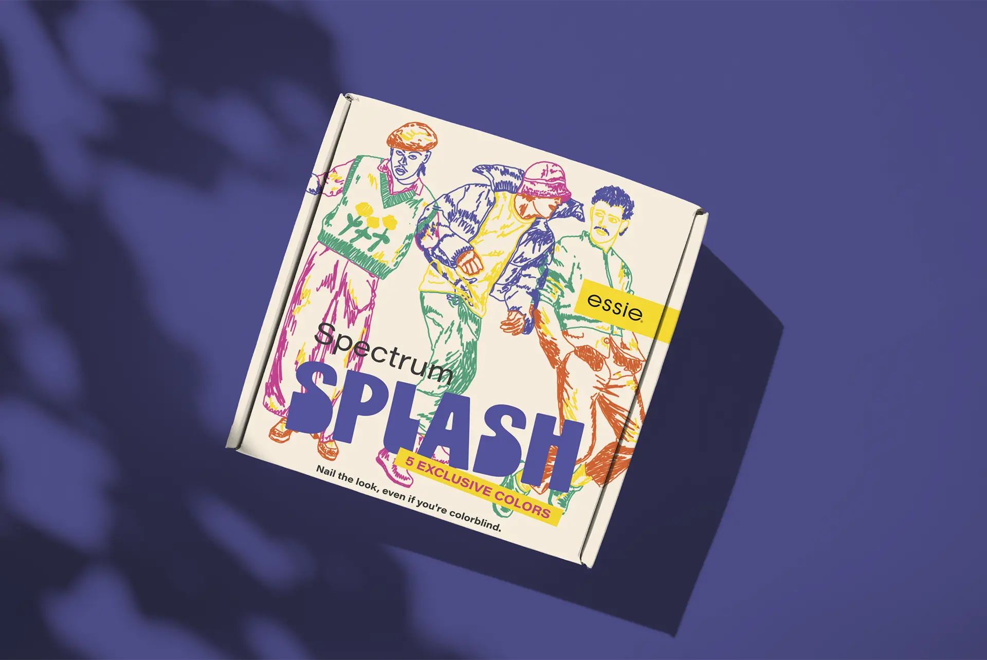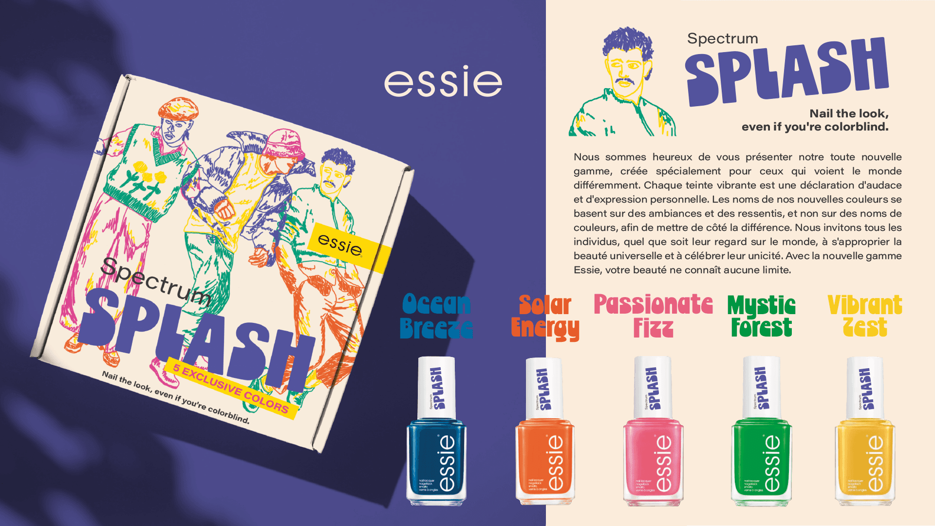 Le projet consiste à créer une nouvelle gamme de vernis Essie, appelée Spectrum Splash, pensée pour les personnes daltoniennes, en particulier celles atteintes de protanopie (difficulté à percevoir le rouge), une condition qui touche surtout les hommes. L’idée centrale est de repenser la perception de la couleur : les teintes sont vives et contrastées pour rester visibles et expressives, même avec une vision altérée. Les noms des vernis ne décrivent pas des couleurs, mais des sensations et des ambiances, afin de dépasser les différences de perception.